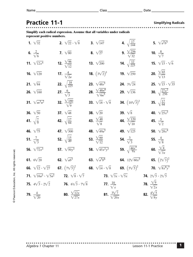 Practice 11-1 Simplifying Radicals Worksheet